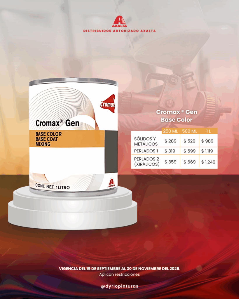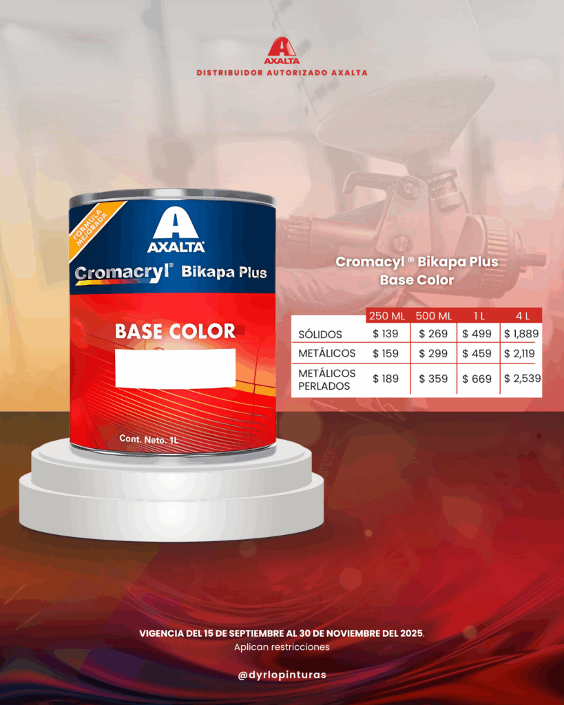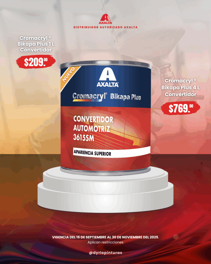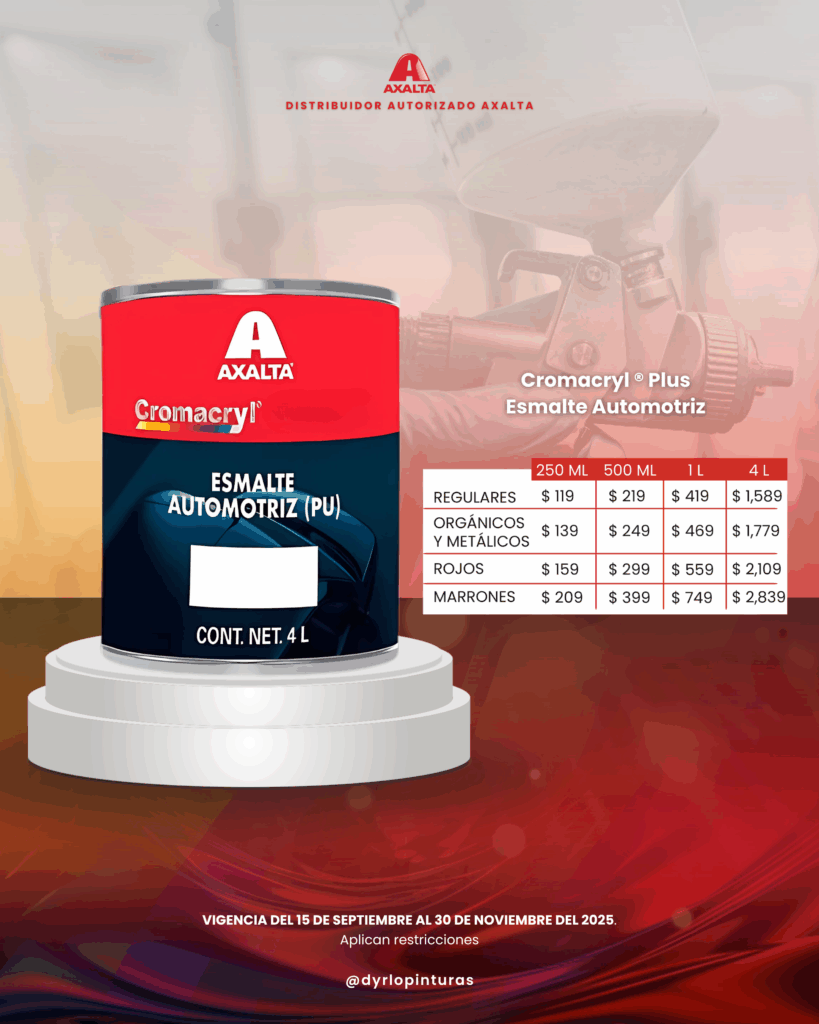 Del 15 de septiembre al 30 de noviembre de 2025, aprovecha precios exclusivos en una amplia gama de productos de pintura, recubrimientos y transparentes de alto desempeño, ideales para lograr acabados profesionales con la tecnología de Axalta®.
