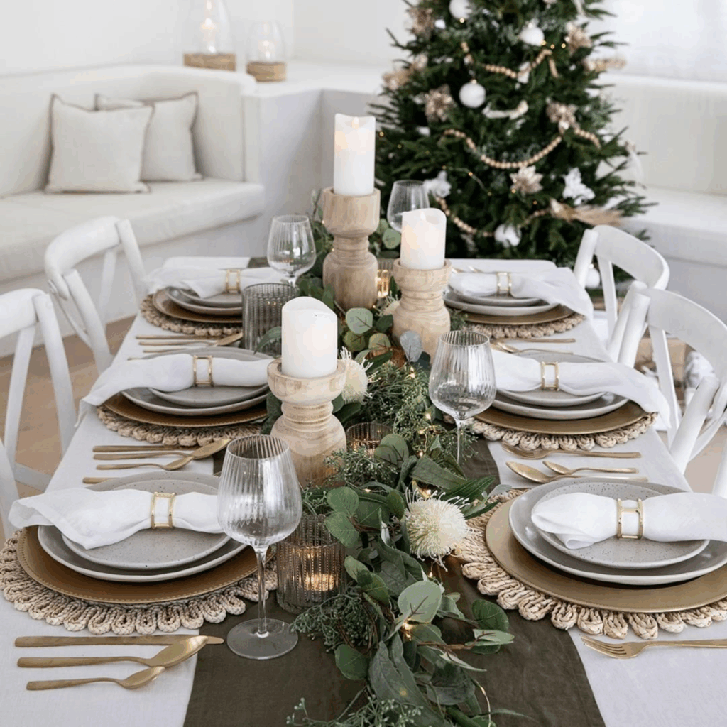 Beige o lino: Luces cálidas, adornos dorados, ramas naturales.